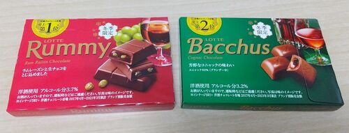 『ラミー(Rummy)』『バッカス(Bacchus)』(ロッテ) (スイーツ、デザート、チョコレート、洋酒チョコレート、冬季限定、アルコール分、成分表示、価格、感想) ・商品説明とアルコール分; 『ラミー』みずみずしいラムレーズンと生チョコを…
