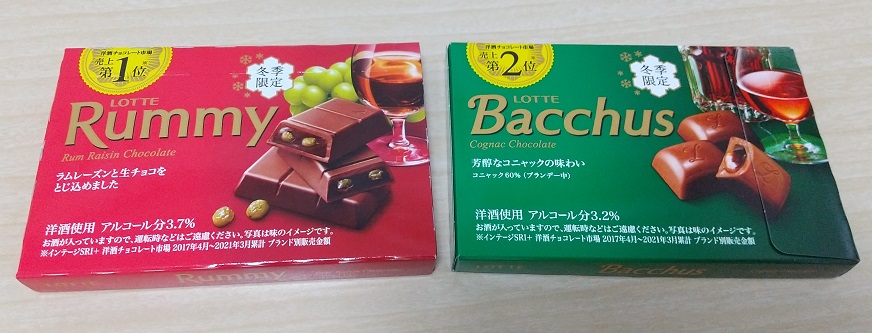 今回は、珍しく市販商品です。”お口の恋人”「ロッテ」さんのチョコレートの感想です。私はお酒は弱いので滅多に飲みませんが、時々洋酒が飲みたくなります。そこでお酒に弱い私でも手軽に洋酒を味わえる『ラミー』と『バッカス』を購入してみました。こちらの商品は、「冬季限定」だそうです。確かに、暖かい季節にはチョコレートが溶けてしまいそうですからね。そして、全然知りませんでしたが、商品パッケージによると、この2つが”洋酒チョコレート”の売上No.1とNo.2だそうです。へぇ~、というか、、他にはあんまり知らないなぁ。。いや、でも昔からあるロングセラーなので美味しいのでしょう。期待しながら食べてみます。