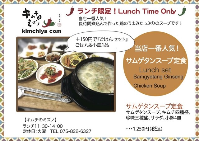 今回は、京都市内のランチ紹介記事です。韓国料理で一番好きなのは「サムゲタン」です。寒くなったり元気が出ないときには、無性に食べたくなりますが安くて美味しい「サムゲタン」が食べられるお店ってないかな?と思っていたら、以前に行った「タイカレーラーメン」のお店の近くでたまたま見つけたのが、今回訪問した『キムチのミズノ』さんでした。キムチ販売店かと思いきや、少し狭いですが普通に料理が食べられるお店でしたね。ランチメニューは「豆腐チゲ」や「ピビンバ」など何種類かありましたが、やはりお目当ての『サムゲタンスープ定食』を注文しました。