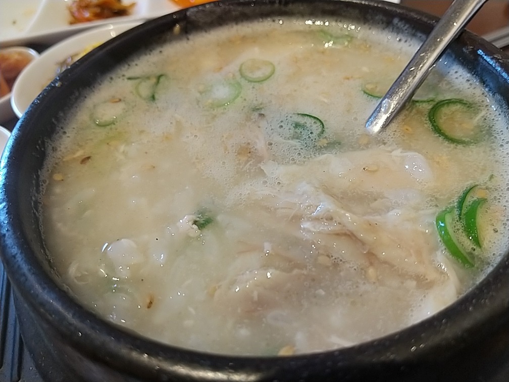 そして、メインの『サムゲタンスープ』ですが、届いたときにはかなりのアツアツでしたが、上のおかず達を食べている間にようやく食べ頃の熱さになっていました。スープの中身は、鶏肉とご飯がメインとなっており、高麗人参などの薬膳具材はほとんど見られなかったのは少し残念でしたけど、味はしっかりと鶏肉などのエキスが溶け込んで美味しかったです。あっさりとした鶏雑炊という感じで、辛めのおかずとの相性も良く期待通りのランチを食べることが出来ました(^^♪。