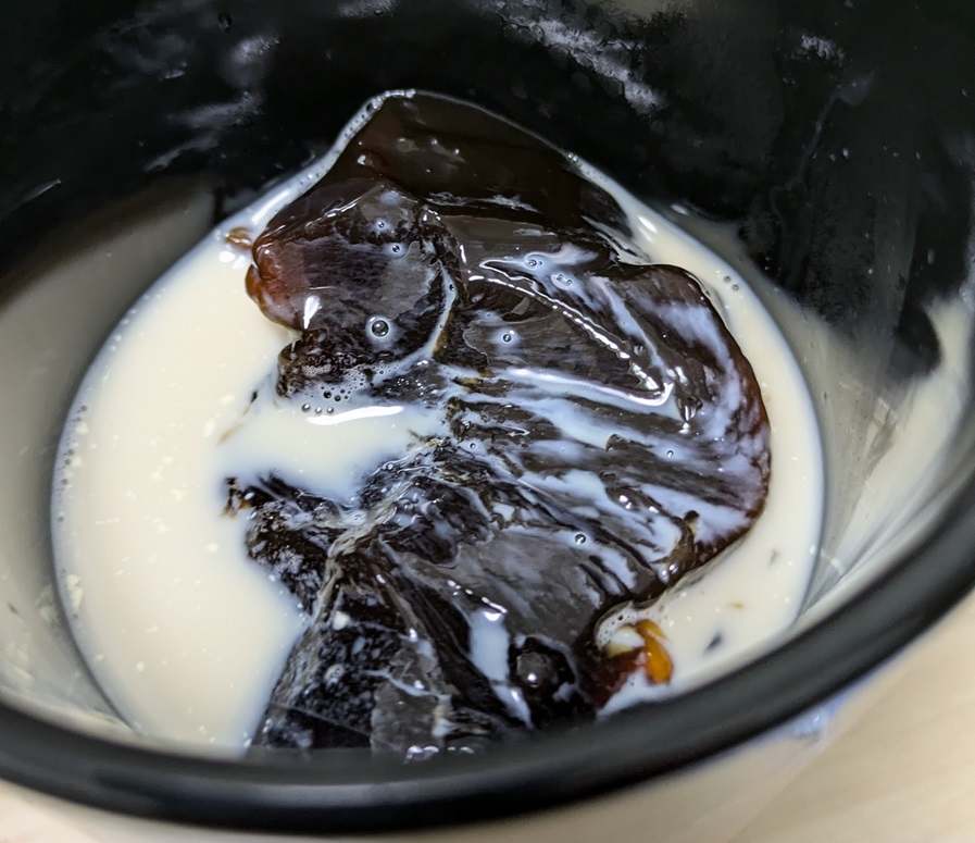 ゼリーの外観は、下写真のように普通に真っ黒なコーヒーゼリーです。牛乳パックのまま食べるには余りにもボリュームがあり過ぎるので、カップに食べたい分だけ入れて、更に豆乳も入れて食べました。味も普通に食べてるコーヒーゼリーとほぼ変わらない。いや、ちょっとコーヒー風味は薄いかな?という感じですが、まぁ値段を考えれば十分かと思います。
