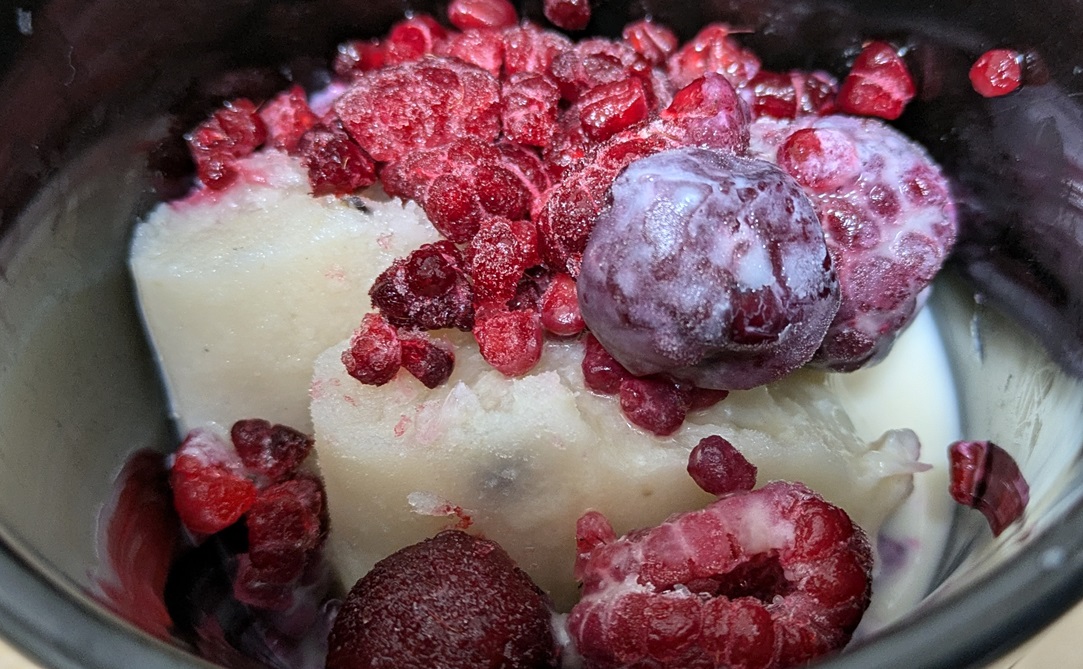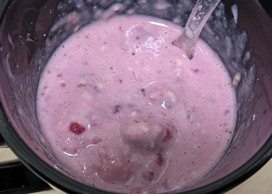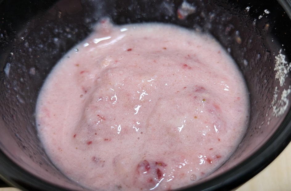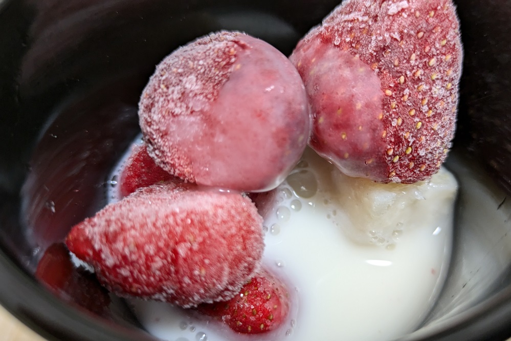 シルサックよりも前にミックスベリーが無くなってしまったので、今度こそは「業務スーパー・総力祭」でセール品になっている『冷凍いちご』(@248円)を使いました。下写真・上のようにサイズはバラバラだけどしっかりと丸ごとのいちごになっていて、シルサック&プロテイン&牛乳と混ぜ合わせたのが下写真・下のような感じです。こちらもちょうどイイあんばいの酸味と甘さで美味しいと思います。
