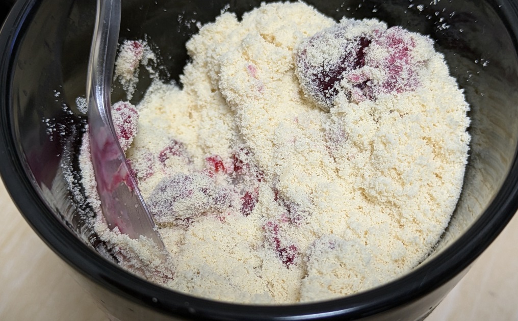 『シルサック』だけの外観などはOTSHOKOPANさんのブログ記事を読んでいただくとして、スムージーを作るのでまずはカップに適量のシルサックと冷凍ミックスベリー(これも冷凍庫に残っていた)と豆乳を投入しました。(下写真・上)そして、そこにプロテイン粉末・杏仁豆腐風味を投入し(下写真・中)、よくかき混ぜて出来上がりです(下写真・下)。かき混ぜましたが、プロテインはいつものシェイカーのようにはうまく混ざりませんでした(-_-;)。実食してみると、フルーツもそこそこ塊りの食感を残していたためかシルサックの繊維っぽい食感が気にならず。味のほうは、ベリーの酸味とシルサックの爽やかさ、そしてプロテイン=杏仁豆腐の甘さがイイあんばいに混ざり合うので個人的にかなり美味しいと思いました。トレーニング後やお風呂上りの火照りにちょうどイイ感じです!(^^)!。