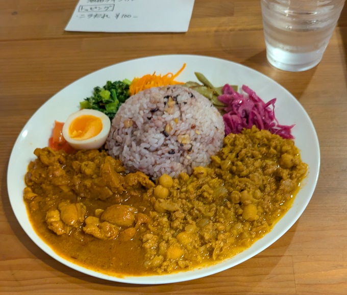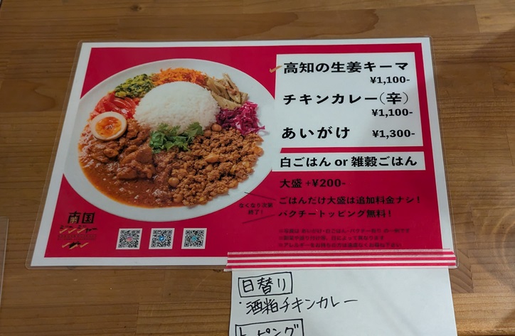 お店はカウンターが4人ほどと2人用の小さいテーブルが2つのこじんまりしたお店でした。本当は荷物が多かったのでカウンターが良かったのですが、先客も荷物をガッツリと置いていたので小さなテーブルになりました…。メニューは下写真のようなシンプルなものです。じっくり考えずに写真の通りに『高知の生姜キーマとチキンカレー(辛)のあいがけ』(価格:1,300円)を注文しましたが、後から考えると日替わりカレーが私が好きな”酒粕”だったのでこっちにすれば良かったかな。。