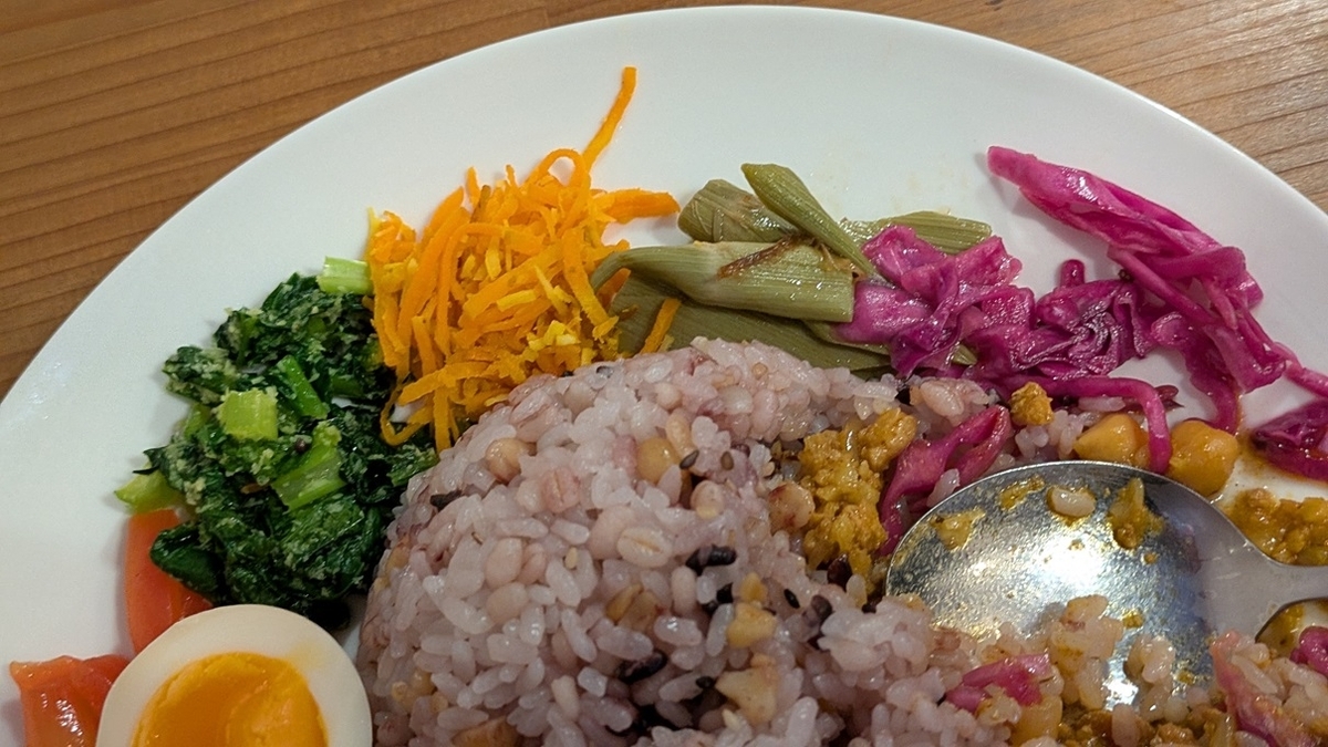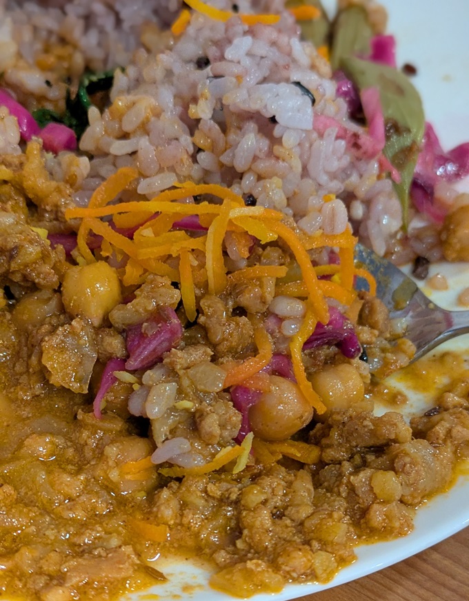 上にも書きましたが、ライスは「雑穀ごはん」ですし、下写真・下段のような高知県の食材を使った付け合わせが付いているので、それらを少しずつ混ぜたりして”味変”が出来るのは嬉し楽しいカレープレートになっていると思います。また食べに来たいと思うカレーでした(^^♪。