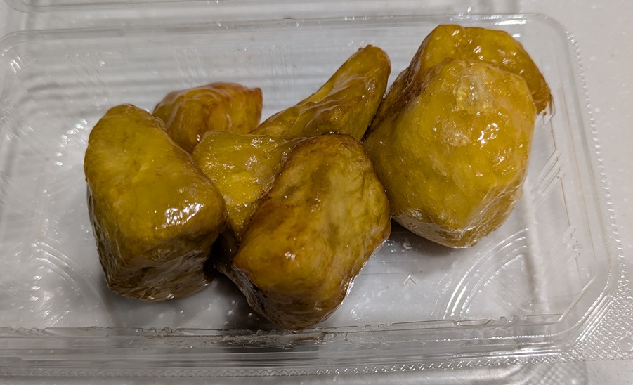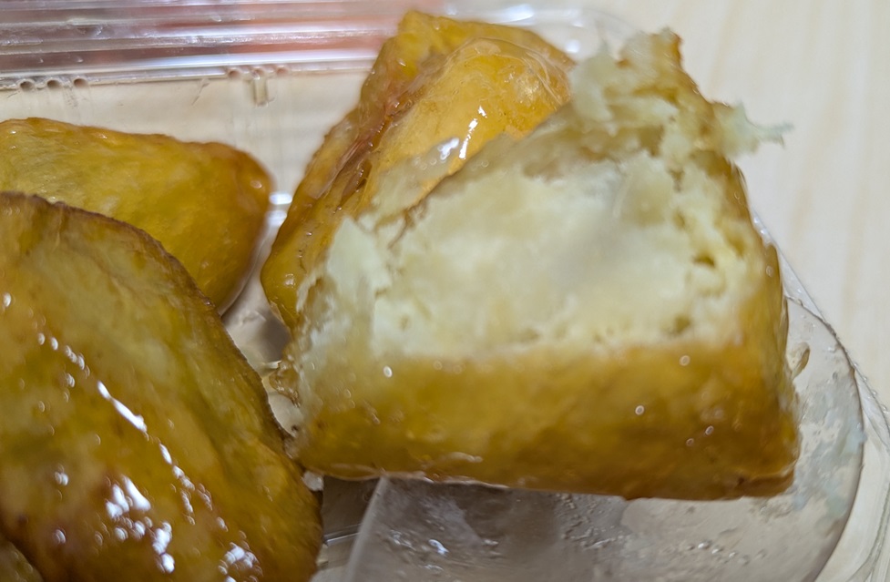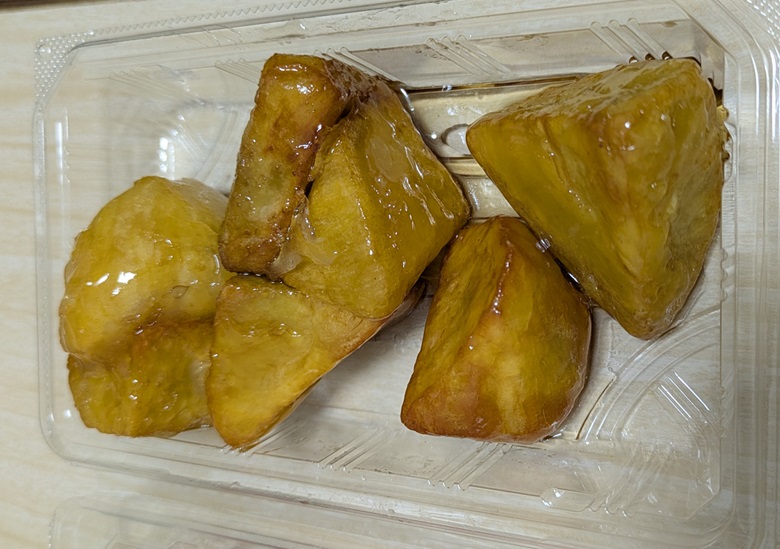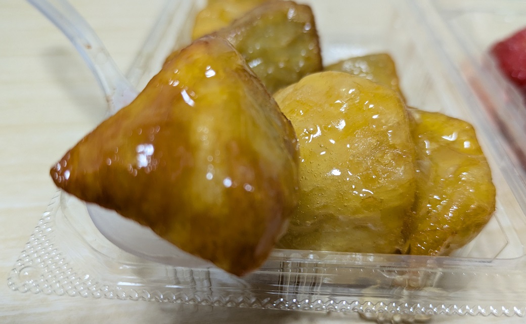 実食してみますと、想像以上に表面がカリカリとして私が好きな食べ応えのある硬さになっています。冷凍食品の自然解凍なのに不思議な感じです。そして、中のポテトは逆にねっとりととろけるような柔らかさになっています。外カリ&中トロは、まるでカヌレのような最近流行りのスイーツという感じがします(^^♪。表面の飴もポテトの風味を邪魔しない適度な甘さで、とても美味しい『中華ポテト』に仕上がっていると思います。
