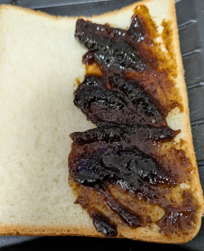 今回もホットサンドメーカーで焼きまして、実食していきます。下写真のような感じで焼きあがりました。味のほうは、思った以上に甘過ぎず苦みをしっかりと感じます。個人的な好みとしては、コーヒーの苦みが好きなので甘すぎるジャムよりも食べやすいと思いました。