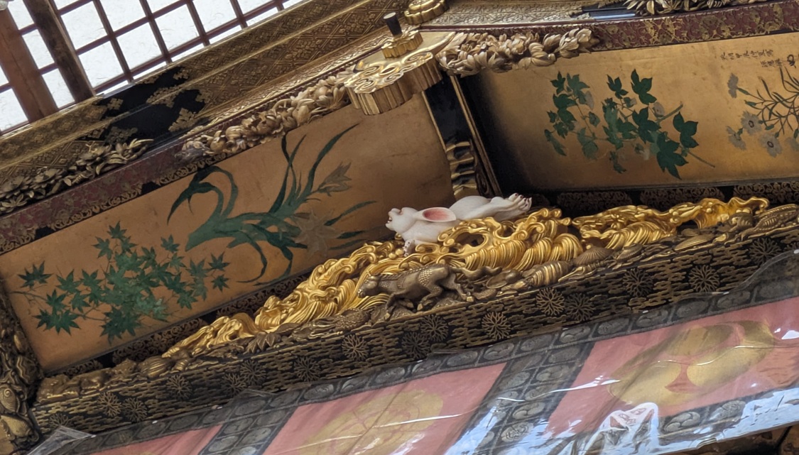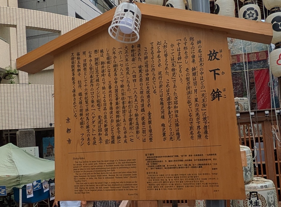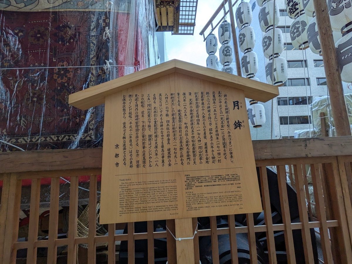 まず、一番目を惹いたのが、トップ写真の『月鉾(つきほこ)』です。周囲のビルとの比較でそのサイズが分かると思います。山鉾のそばには下写真のように説明書きのある立札があります。大きさにも圧倒されますが、その装飾もかなり凝っていて美しいと思います。この月鉾の屋根下の破風中央の彫刻は左甚五郎作と言われている”うさぎ”がいました。(下写真・一番下)やはり、”月”という名の山鉾だからですかね?