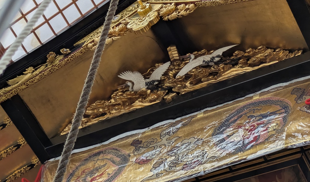 次には、同じく天を衝くようなサイズの外観が特徴的な山鉾である『放下鉾(ほうかほこ)』に出会いました。月鉾ほどではないものの、下写真で分かる通りかなり高さのある山鉾でした。近すぎて写真に収まりきりませんね。。こちらの破風の彫刻は”丹頂鶴”でした。